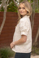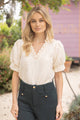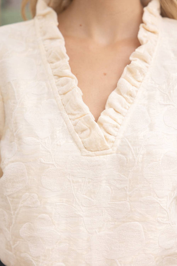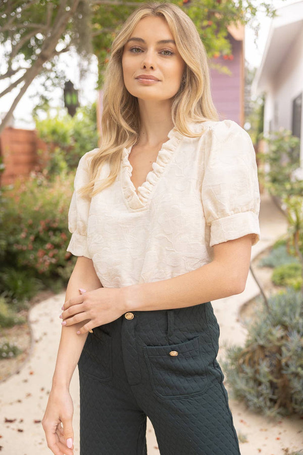 The Sweet Magnolia Top features a flattering V-neckline and charming short puff sleeves, accented with a delicate ruffled neck detail. Made with a luxurious floral burn out velvet fabric, this top is perfect for adding a touch of elegance to any outfit. Model height 5' 8”, wearing size Small