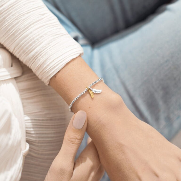 Our A Little 'Feathers Appear When Loved Ones Are Near' Bracelet features a captivating design that will dazzle with every movement. Featuring a stretch-bead style and a beautiful silver-plated charm, wrapped around one of our stylized cards and framed by a sweet poem. It's oh-so special.