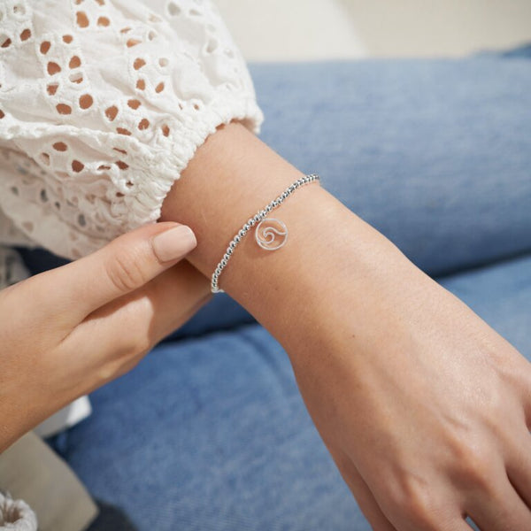 Our A Little 'Makes Waves' Bracelet features a silver-plated design that will dazzle with every movement. Featuring a stretch-bead style and a sparkling silver wave-shaped charm, wrapped around one of our stylized cards and framed by a sweet poem.