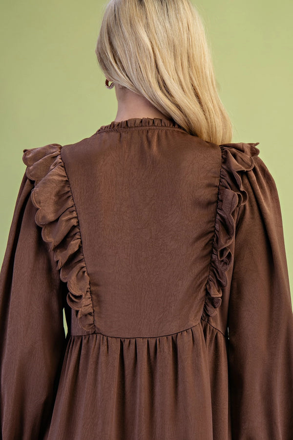 The Acorn Whisper Dress brings a playful charm with its tiered long sleeves and a flattering midi length. Featuring a pleated front that adds texture and movement, this dress is finished with delicate scalloped ruffle details for a touch of whimsy. Perfect for twirling through any occasion, it offers both comfort and style in one delightful package.