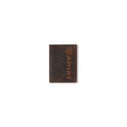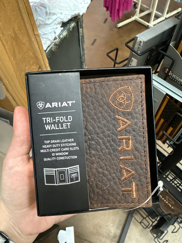 Ariat trifold wallet by M&F Western Products. This great wallet is made of genuine brown bull hide leather with a brown Ariat name and logo embroidered along the side. Slim fit design. Heavy duty stitching with multiple card slots.