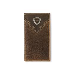 This Ariat rodeo wallet by M&F Western Products is genuine leather. Brown rowdy body with crazy horse overlay. Accented with a multi finish Ariat shield concho. Multiple card and cash slots, checkbook slot and ID window on the inside.