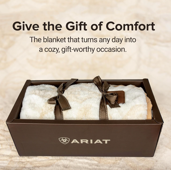 Snuggle up with the ARIAT Quilted Blanket, measuring 50" x 60". This lightweight, ultra-soft, and cozy throw keeps you warm and comfy, all wrapped up in a charming gift box that's perfect for sharing the snug vibes.