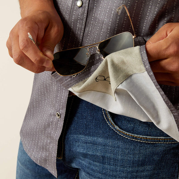- Microfiber lens cloth is hidden in the hem for on-the-go cleaning