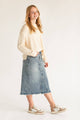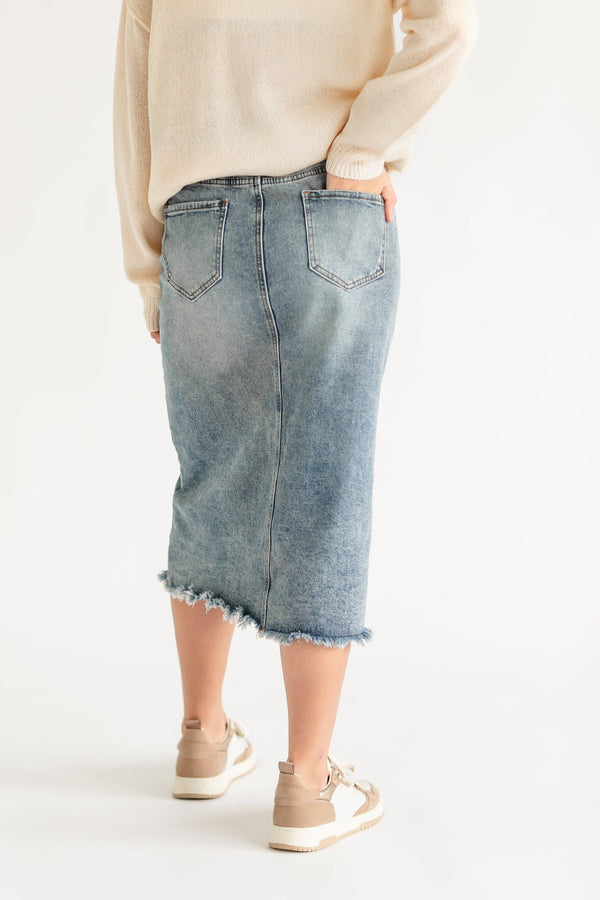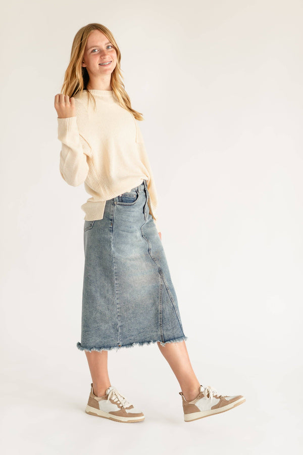 The Avril Skirt is just as sweet as it sounds! This modest a-line skirt is adorned with a raw hem and functioning pockets. A button front closure and has ultimate walkability! It is a medium-wash denim that can be worn any time of year.