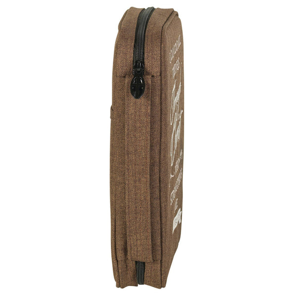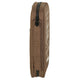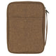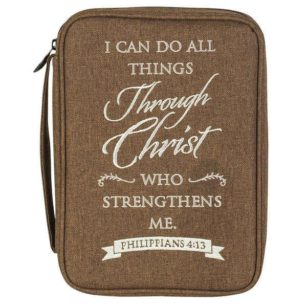 Coffee tone Bible cover is beautifully embroidered in cream with "I can do all things through Christ who strengthens me" and Philippians 4:13 verse reference. Outer fabric is a rugged 600 denier polyester. Also on outside is a side carrying handle and open back pocket. Side zipper is non-rusting and self-repairing, finished with a spoon style cross design pull. Cover lays flat when open; inside is an attached pen loop and ribbon bookmark. Nylon reinforced stitching throughout. The Large size holds a Bible or book up to about 6 3/4" x 9 1/2" x 1 3/4".