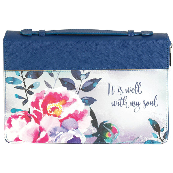 Bible cover with navy-colored body and pink/floral accents on the front. Features inspiring text: It is well with my soul. Size large.