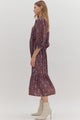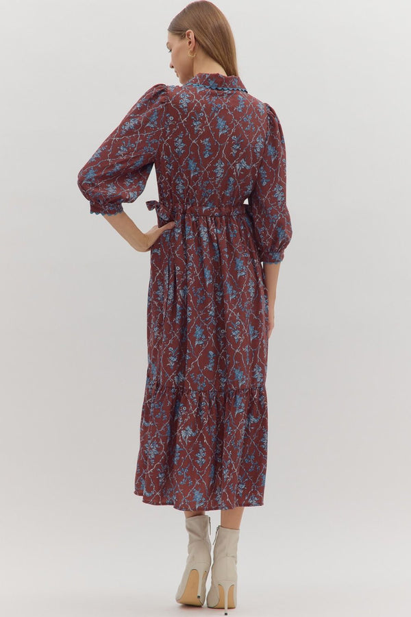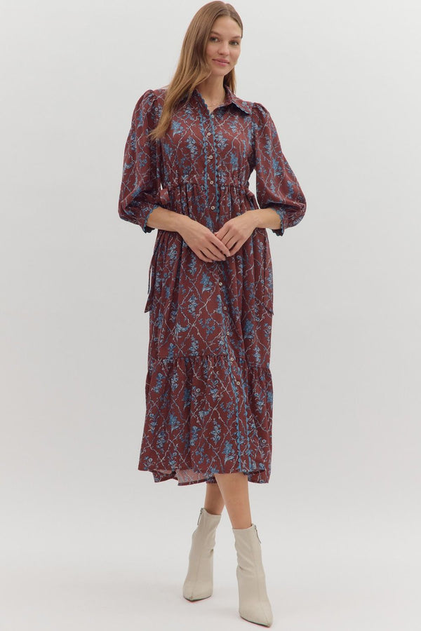 This charming midi dress brings a fresh burst of floral fun with its 3/4 puff sleeves and sweet collar detail. The button-front closure adds a touch of classic flair, while the elasticated waist with adjustable self-tie lets you find your perfect fit. Finished with a playful ruffle hem, this lightweight, woven beauty is fully lined and non-sheer—ready to brighten your day with effortless style.