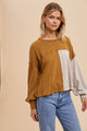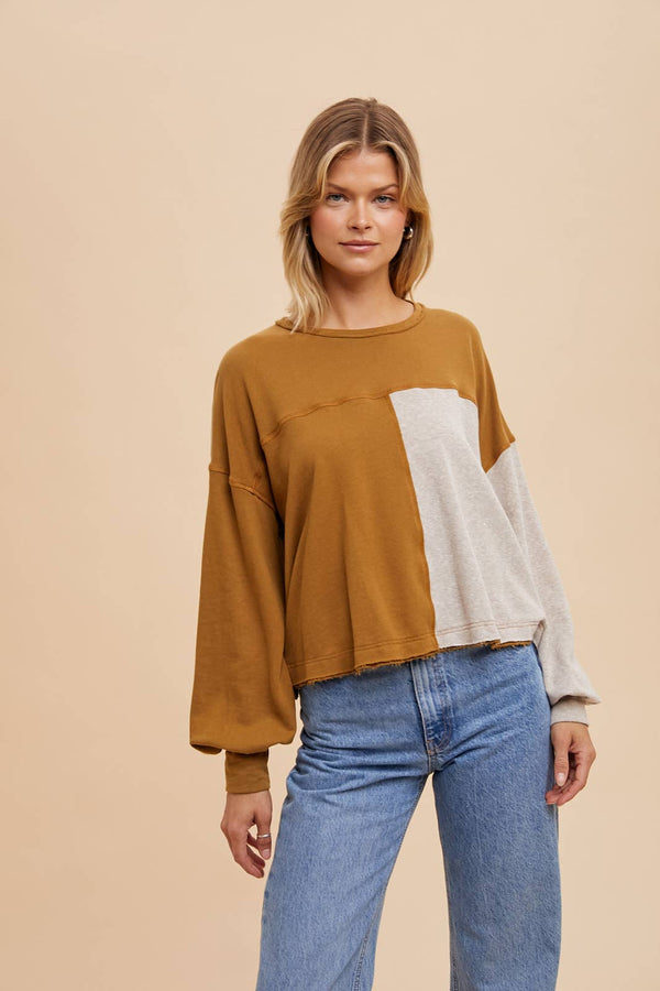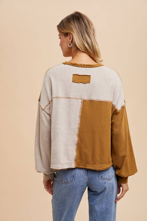 This spliced top brings cozy vibes with a soft garment wash and comfy French terry fabric. It shows off relaxed drop sleeves and cuffed ends, all jazzed up with fun contrasting colorblock panels for a fresh look.