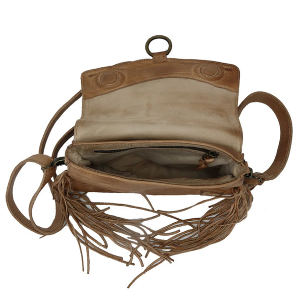 - Compact crossbody with adjustable and removable strap, fun fringe