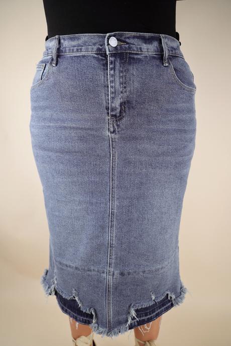 This destroyed hem design is made of premium denim, double layered throughout the hem (front and back) for modesty. Cut with a slight flared hem, this stretchy skirt is very comfortable and no slit is necessary. You won't find this skirt anywhere else!