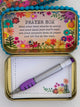 Keep your prayers close and your spirits high with our Tin Prayer Box! Featuring beautiful artwork and a heartwarming message on the inside, this box is sure to bring a smile to your face. With 50 paper notes and a small mechanical pencil included, you'll always have a way to jot down your thoughts and intentions. Perfect for anyone who needs a little pick-me-up throughout the day.