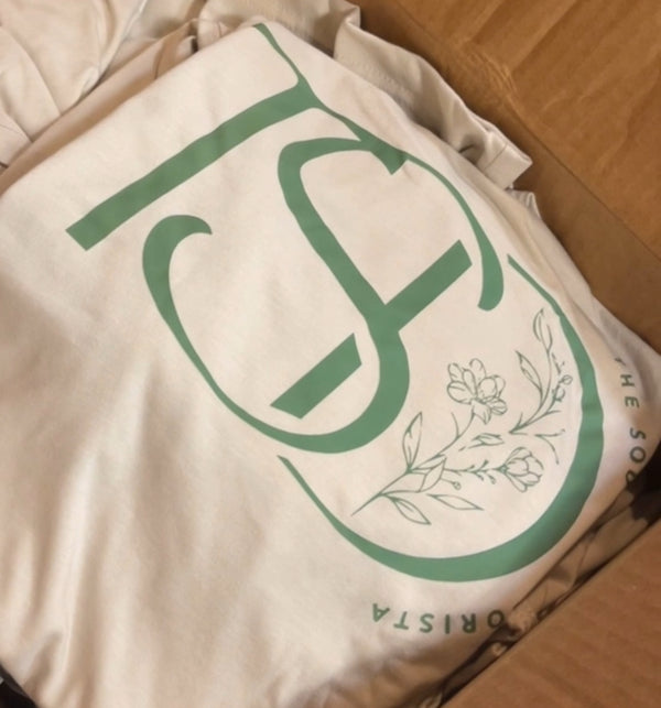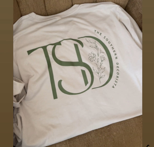 Show your love for us at TSD with our logo shirt. There is a small logo on the front left chest and a large logo on the back. The shirt is short sleeve and Bella Canvas brand. The lettering is sage green and the T shirt is beige.