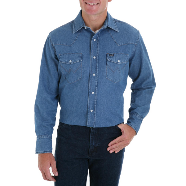 THE ORIGINAL WORK SHIRT FOR COWBOYS One wardrobe staple a cowboy should never be without is a work shirt that can hold its own. That's precisely why our Cowboy Cut® work shirt is designed with hard work in mind, so you can get any job done with total confidence. Every Cowboy Cut® work Western denim snap shirt comes with all the authentic details you'd expect from a tried-and-true Wrangler® essential, including Western front and back yokes, a spread collar, two spade flap snap pockets, the Wrangler® logo riser label on the left pocket, and our decorative 'W' stitching. Just like the jeans in our Cowboy Cut® collection, the Cowboy Cut® Western snap denim work shirt will keep you dressed and ready for anything.