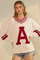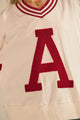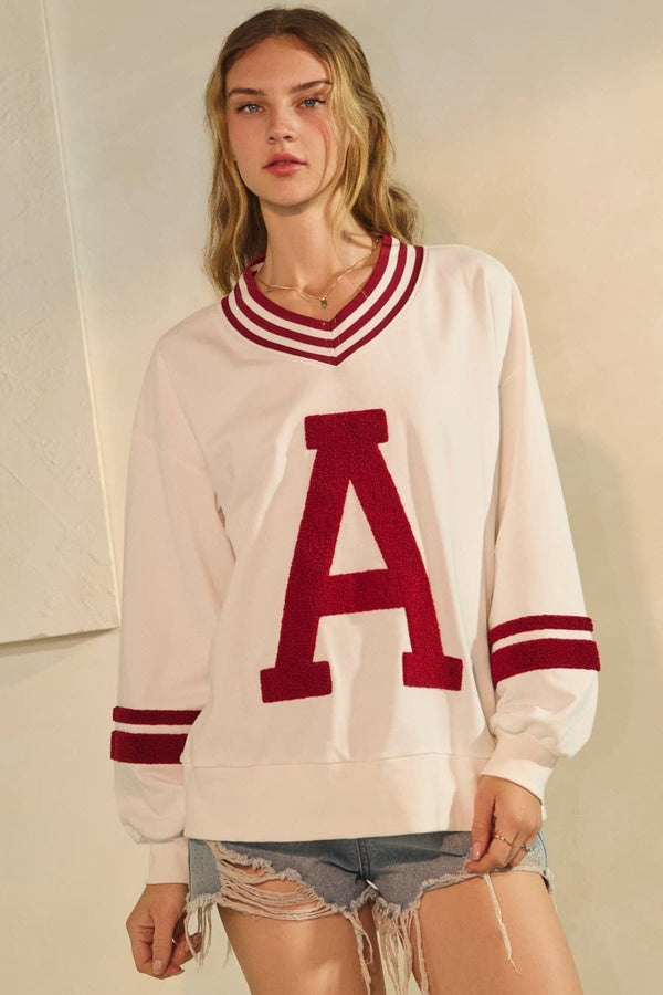 Cheer on in style with the Stadium Sweetheart Top! This playful gameday pullover sports a bold boucle "A" patch and classic striped V-neckline and cuffs, giving you those varsity vibes perfect for football season. Made from a soft cotton and polyester blend, it offers cozy comfort whether you're in the stands or hanging out with friends. Game day just got a whole lot cuter!