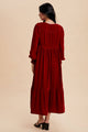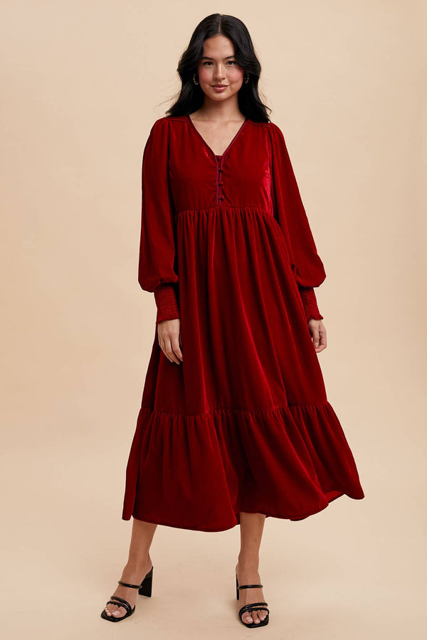 Introducing the Under the Mistletoe Dress: a stunning maxi dress perfect for any occasion. Made with luxurious velvet and featuring a V neckline and functional button design, this dress will make you feel elegant and stylish. The smocked sleeve ends and flounced hem add a touch of femininity, while the satin accents and hidden side zipper provide a polished finish. Fully lined with satin fabric for ultimate comfort.