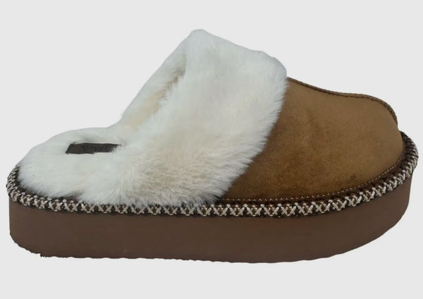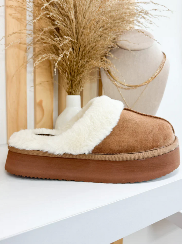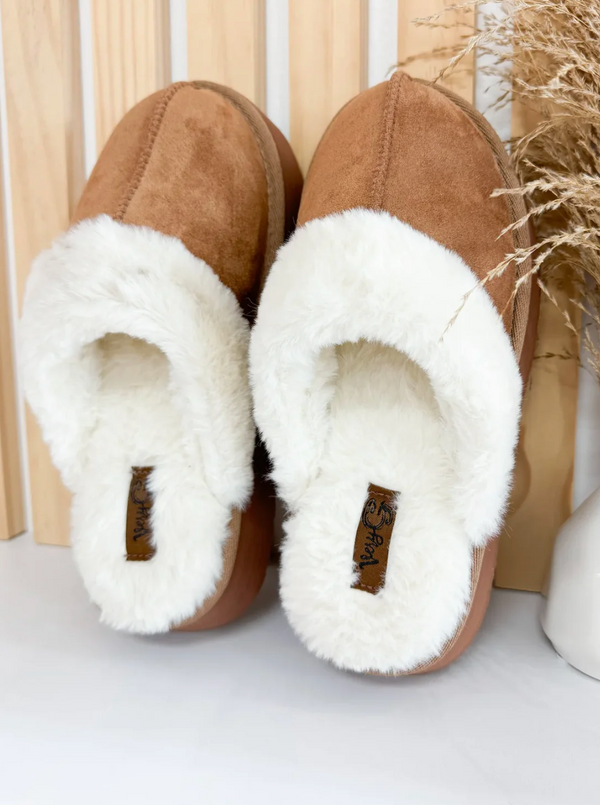 Upgrade your loungewear game with the Very G Delaney Slippers in Tan. These platform slippers feature fuzzy insoles for ultimate comfort. Slip them on and feel like you're walking on clouds, with a stylish twist. Perfect for relaxing at home or running errands in style. Tan-tastic!