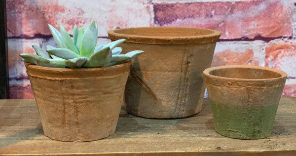 Wembley terra cotta farm pots, mossed redstone, 6.3", 5.1", 3.9".