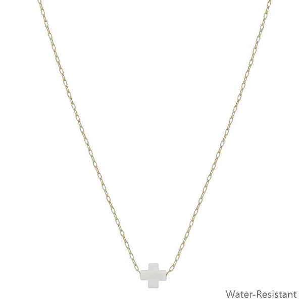 Add a touch of elegance to your outfit with our White Resin Cross Necklace! The water-resistant gold chain perfectly complements the beautiful white resin cross pendant. With an adjustable length of 16"-18", this necklace is perfect for any occasion. Make a statement and show off your faith with this stunning piece.