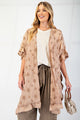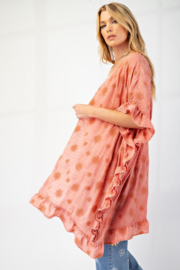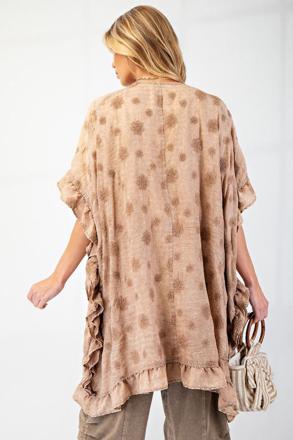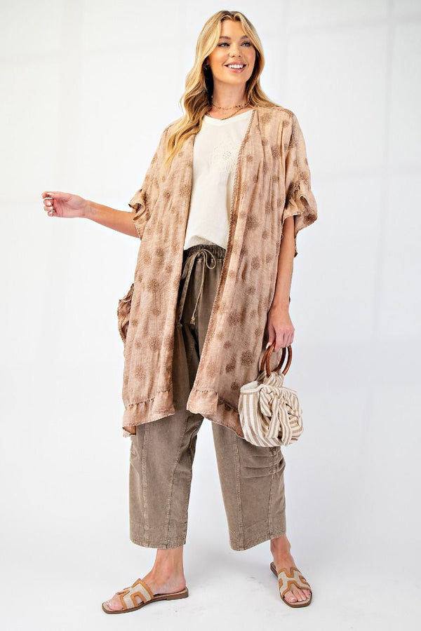 Embroidery gauze mineral washed duster with an open front with no closure. This Willa cardigan has ruffled detailing, lightweight fabrication, and fits as a relaxed loose fit.