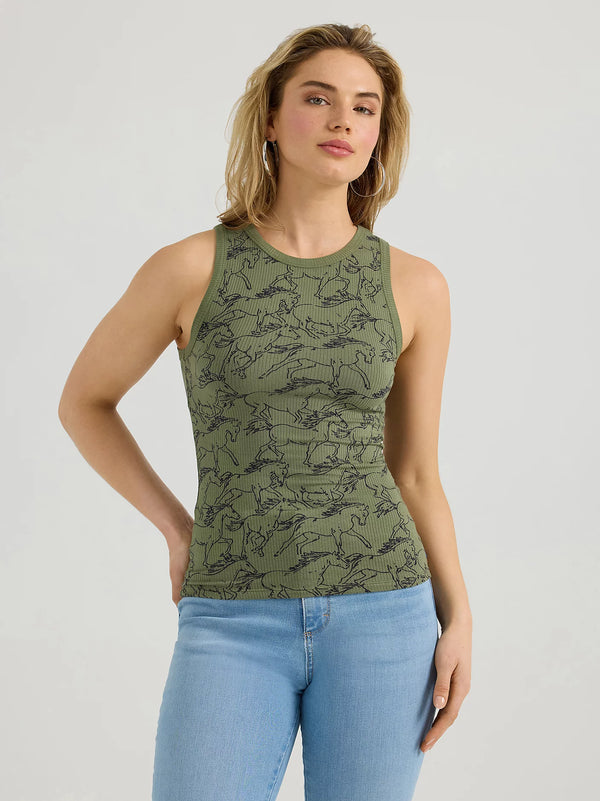 Take the reins on summertime with our Women’s Wrangler Retro® Slim Fit Goddess Tank. It features a high-cut neckline, a sleeveless silhouette, and a slim fit for an easy, flattering choice on sunny days. It's crafted from rayon with just a hint of stretch to keep you extra comfortable. This tank also features a cool graphic print of galloping horses.