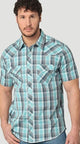 Wrangler Snap Plaid Short Sleeve Shirt in Blue Sea