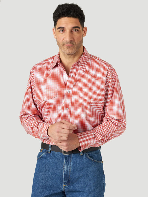 This relaxed fit Wrangler Men's Long Sleeve Snap Shirt in rust plaid combines comfort with style. The wrinkle-resistant fabric keeps you looking sharp all day without the hassle of ironing. Perfect for work or casual outings, the classic snap closure adds authentic Western flair while ensuring effortless wear. Elevate your wardrobe with this versatile essential.