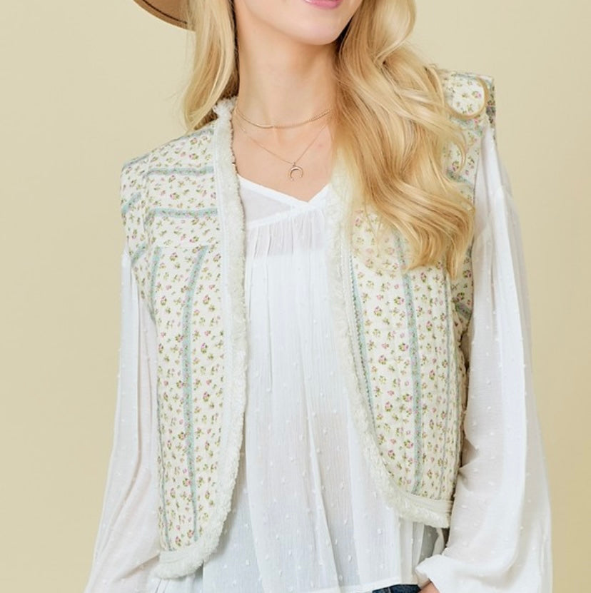 Unleash your inner flower child with the Mis Vest. This quilted vest features a playful floral print and fringe tassel details, adding a touch of whimsy to any outfit. Stay warm and stylish in this unique, one-of-a-kind piece.