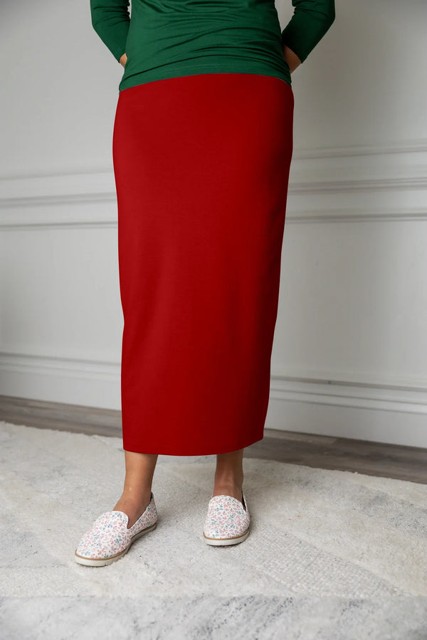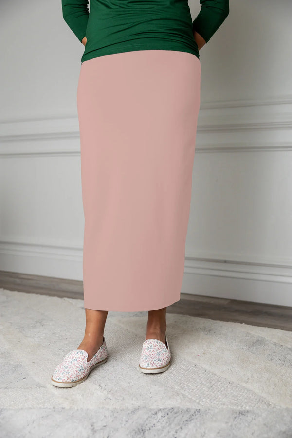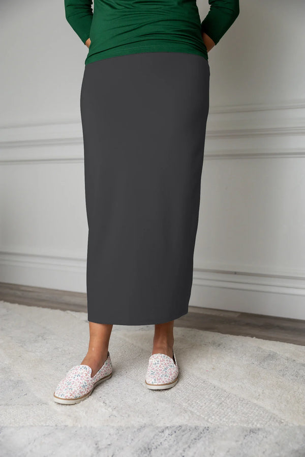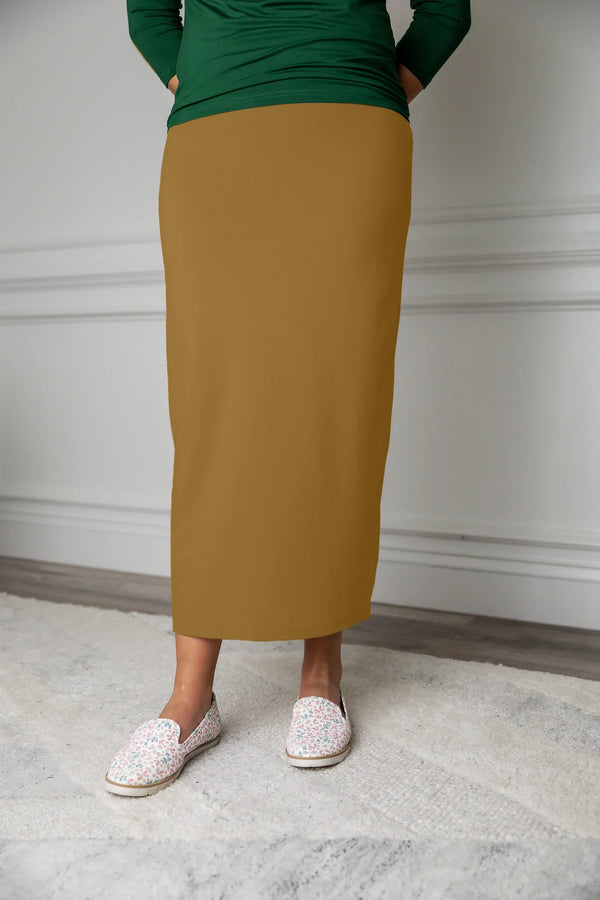 Our modest, essential midi skirts are by far our most popular selling item! You will love slipping this skirt on, dressing it up, or dressing it down. It is made of a soft knit that has gone through several quality checks. It washes and wears well, won't shrink or pill up, and best of all... doesn't need ironing! The waistband features a super soft, stretchy elastic that makes it a dream to wear. It is cut out slightly at the hips and back in at the hem for a truly classic, modest look. Various colors and prints Available in 27",31" and 34".