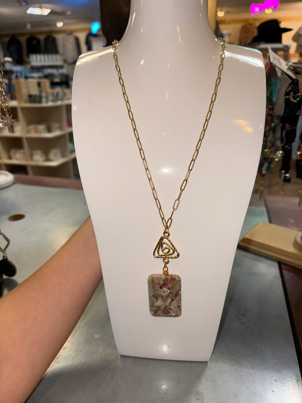 Add a splash of fun and flair to your look with the Triple Play Turquoise Stone Chain Necklace. This eye-catching piece features a long chain adorned with a whimsical triangle swirly connector leading to a stunning rectangular turquoise mix stone. Perfect for layering or wearing solo, it brings a playful pop of color and charm that effortlessly elevates any outfit.