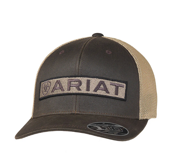 Go out looking great in this Ariat men’s cap by M&F Western Products. There is a brown front panel and bill with an Ariat shield logo patch. Tan mesh back with snap back closure will give you a perfect fit. 30% Cotton, 67% Polyester, 3% PU Spandex.