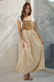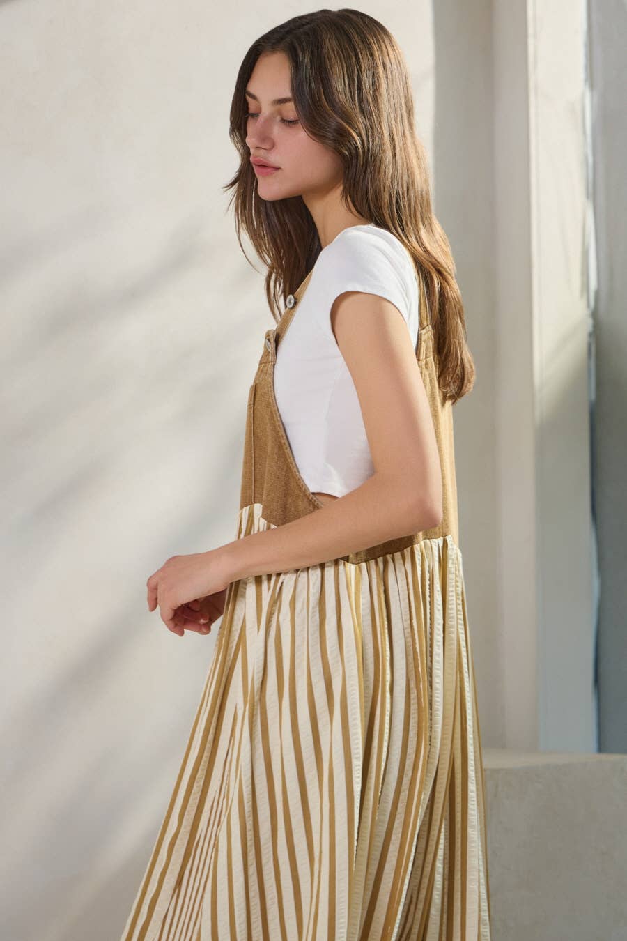 The Caramel Swirl Dress combines a washed taupe colored denim overall with a playful striped skirt for a fun, fresh look. Made from a comfortable blend of cotton and polyester, this 53" dress is lightweight yet durable, perfect for adding a pop of charm to your everyday style. The Caramel Swirl Dress offers a whimsical twist on classic denim that's sure to brighten your wardrobe.
