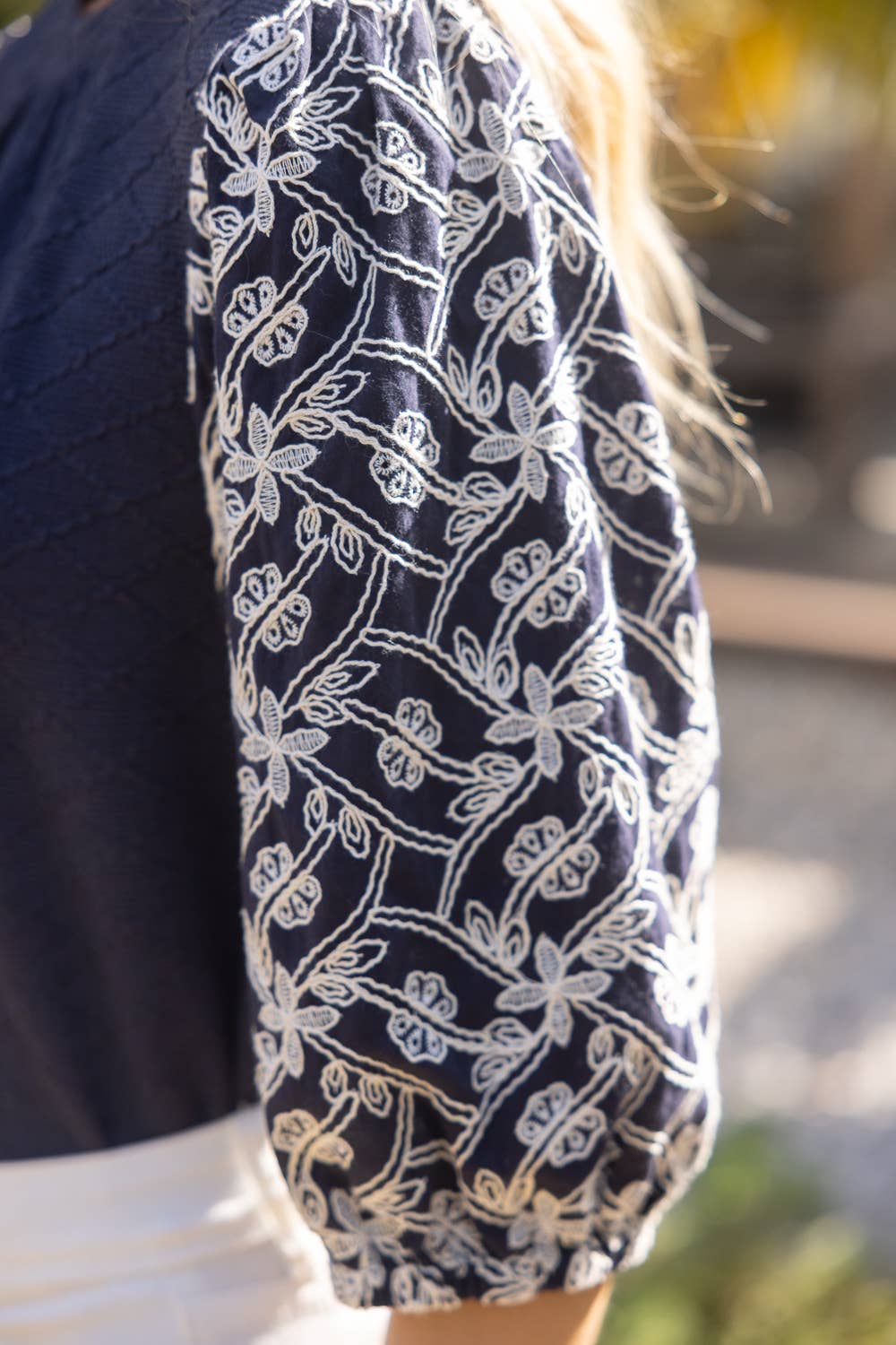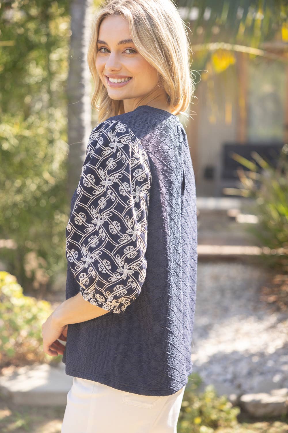 Experience the beauty of The Indigo Garden Blouse. Featuring a round neckline and floral embroidered short sleeves, this blouse offers a stylish and feminine touch. The textured knit body and mixed knit fabric provide comfort and versatility. With a back neck button and elastic loop closure, this blouse is perfect for any occasion. Available in sizes small to large. Model is 5' 8" and wears size small.