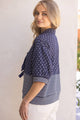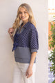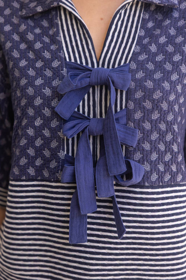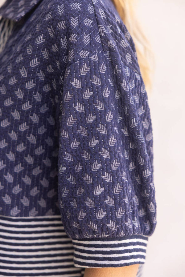 Take your nautical style to the next level with our Nautical Nights Top. This top boasts a collared v-neck design and half puff sleeves. The front contrast bow detail adds a touch of femininity, while the print mixed quilted knit fabric adds texture and depth. Model height 5' 8”, wearing size Small