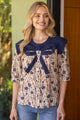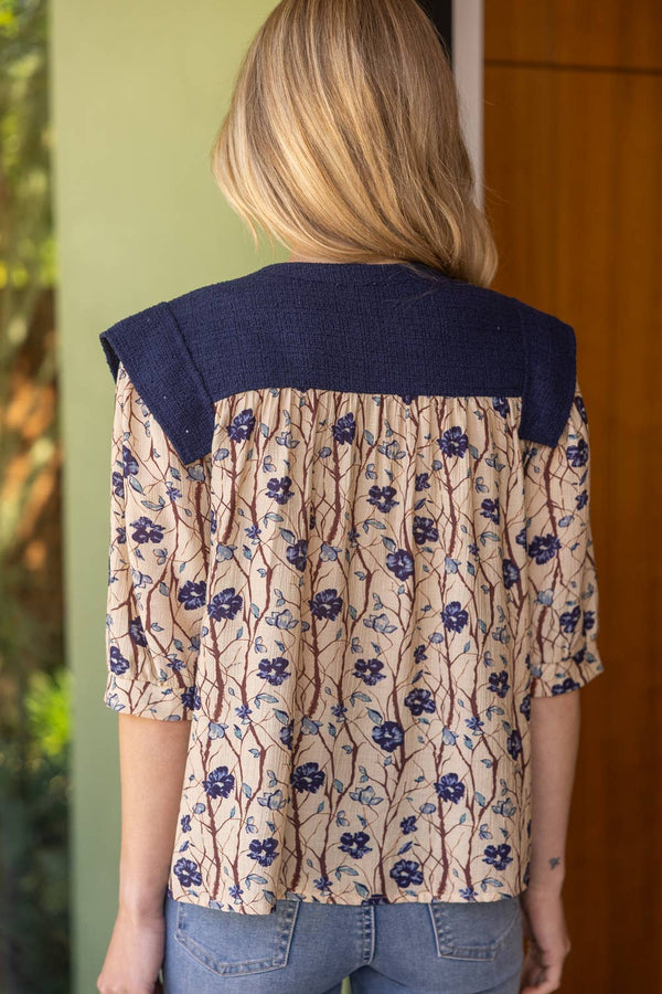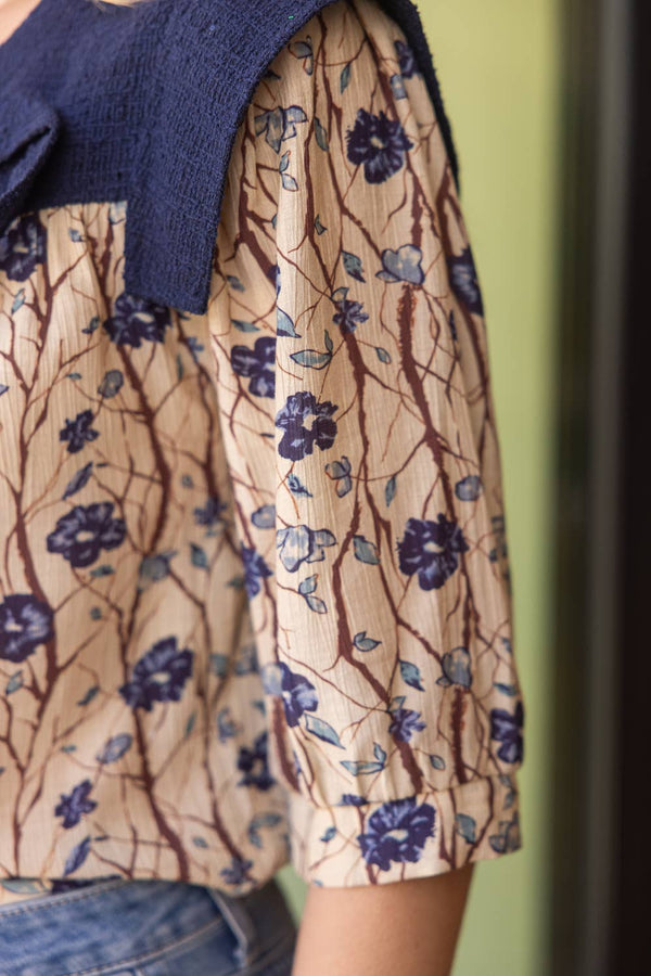 Elevate your summer wardrobe with our Summer Storybook Top. Featuring a round neckline with band, half puff sleeve, and a solid contrast tweed yoke with bow detailing, this top is both chic and comfortable. Made from a floral printed woven fabric, it's the perfect addition to any outfit. Model is 5' 8" and wearing size Small.