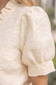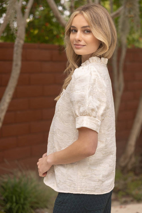 The Sweet Magnolia Top features a flattering V-neckline and charming short puff sleeves, accented with a delicate ruffled neck detail. Made with a luxurious floral burn out velvet fabric, this top is perfect for adding a touch of elegance to any outfit. Model height 5' 8”, wearing size Small