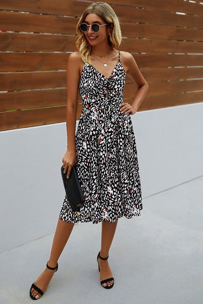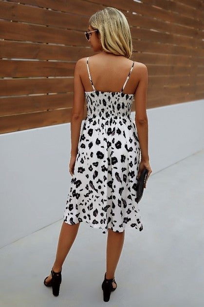 V Neck Spaghetti Strap Leopard Cut Out Midi Dress