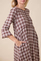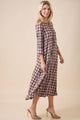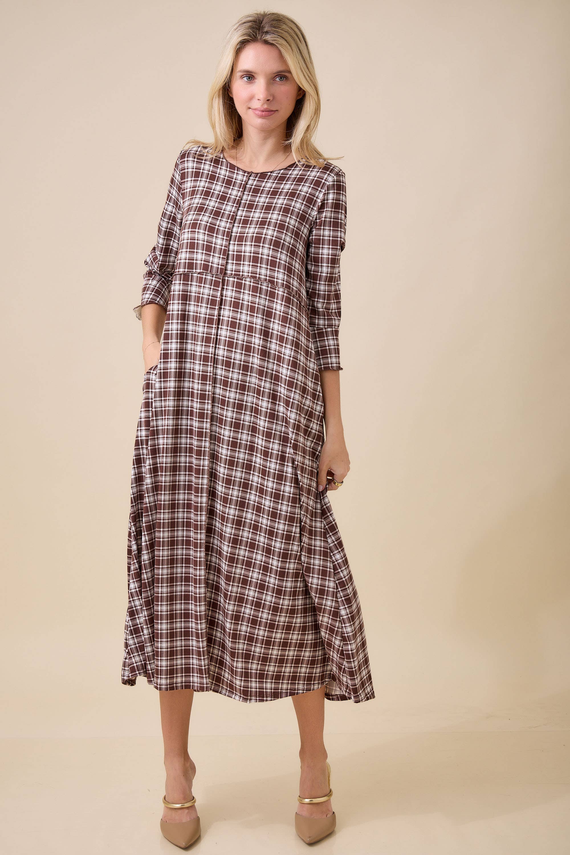 plaid dress, modest dress, checkered dress, fall dress, casual plaid midi, plaid long dress, boutique women’s fashion, comfortable modest dress, side pocket dress, relaxed fit dress, woven plaid outfit, autumn women’s apparel, timele