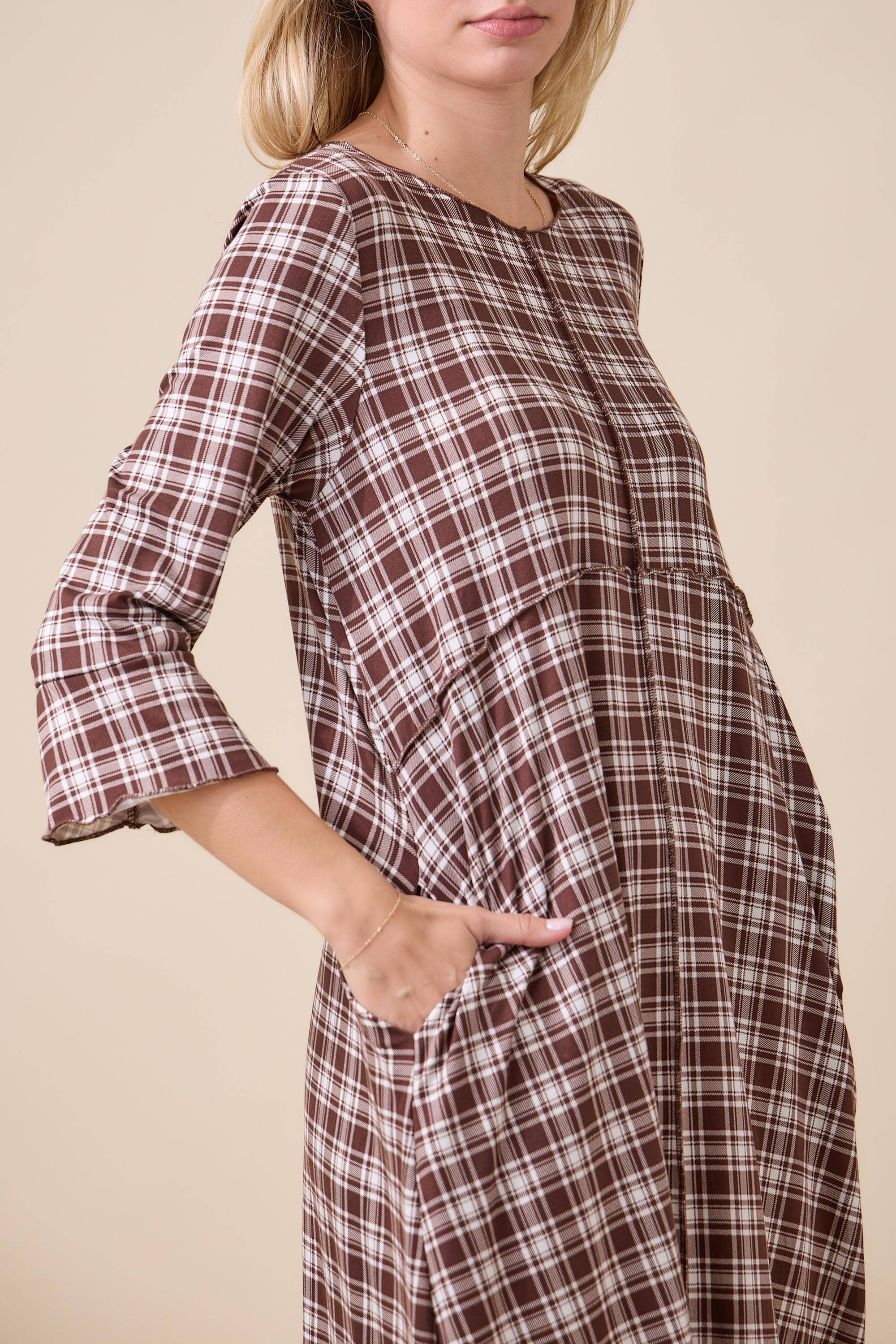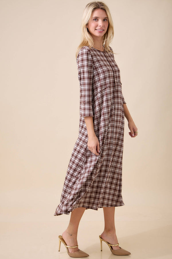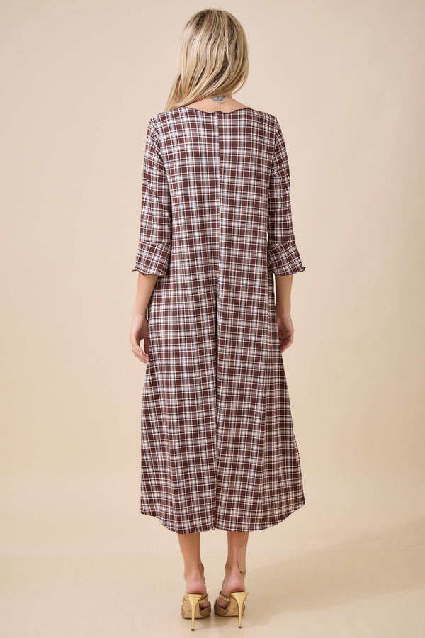 Add effortless charm to your collection with this classic plaid midi dress, crafted for a timeless and modest look. Made from a lightweight woven fabric, this dress features 3/4 sleeves with subtle ruffle cuffs, a round neckline, and functional side pockets for an easy, practical touch.