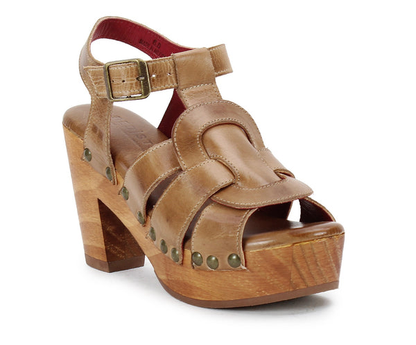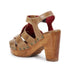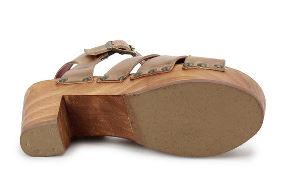 These sandals feature a wooden platform heel, leather upper with a t-strap design, and an adjustable buckle ankle strap. The leather has a distressed look with visible stitching and brass stud details. The sandals are designed with an open toe and a red-colored insole lining.