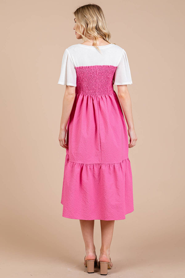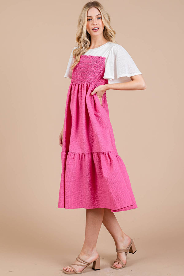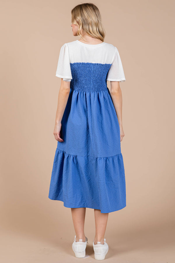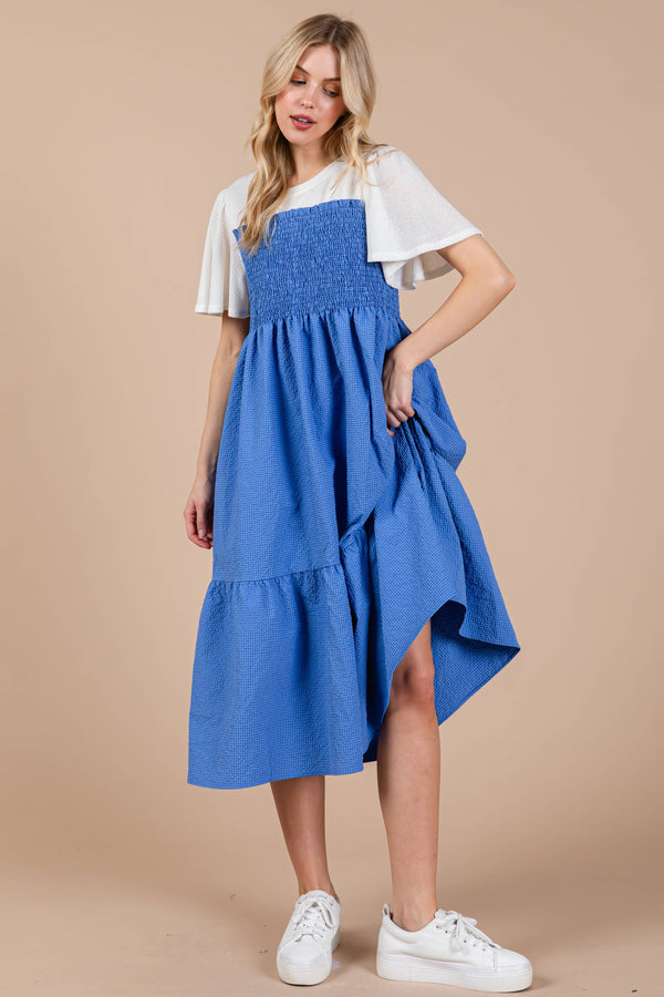 Experience the wonder of the Olivia Dress - crafted from mid-weight, non-stretch poplin. With a smocked elastic bodice, flounce hem, and a covered elastic square neckline and flutter sleeves, this dress is both comfortable and stylish.