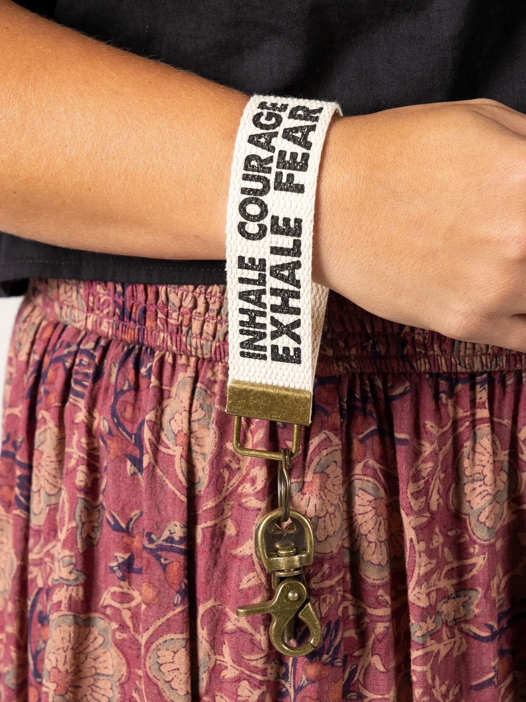 Keep your daily inspiration close at hand with our Canvas Key Chain. The webbing loop is comfortable on your wrist, while the antiqued brass key ring and lobster clasp make it easy to clip to your bag or belt loop. A perfect reminder every time you reach for your keys!