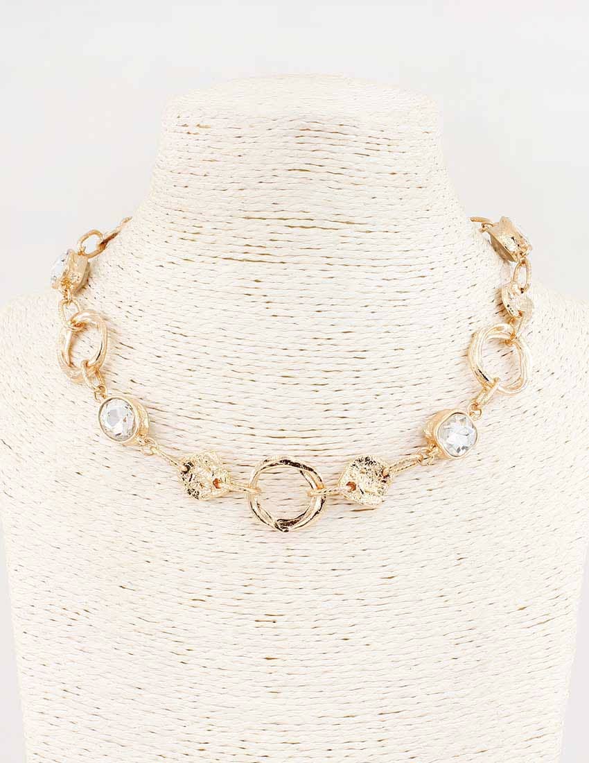 Elevate your style with the Gold Textured Necklace with Clear Stone 16"-18" Necklace from What's Hot. This link and chain necklace is a stunning addition to any outfit. Crafted by a mom and daughter duo who travel the world to bring you the latest trends, this piece reflects their commitment to fashionable, affordable accessories. Enjoy this chic piece from What's Hot.