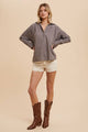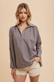 This oversized V-neck shirt comes with a playful collar, charming gathers at the shoulders, split side seams, and a fun high-low hem for a casual, breezy vibe.