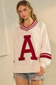 Cheer on in style with the Stadium Sweetheart Top! This playful gameday pullover sports a bold boucle "A" patch and classic striped V-neckline and cuffs, giving you those varsity vibes perfect for football season. Made from a soft cotton and polyester blend, it offers cozy comfort whether you're in the stands or hanging out with friends. Game day just got a whole lot cuter!