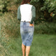 This straight fit skirt is all the things! You're going to love the Inherit Designed Veronica Medium Wash Midi Skirt! This lightweight jean skirt has subtle distressing in a few little spots and classic belt loops. Wear it all year long with any outfit dressed up or down! The raw hem adds a fun detail along with the slight monkey wash on this straight fit skirt! A kick-pleat in the back helps with walkability and you'll love the stretch of this skirt as well!